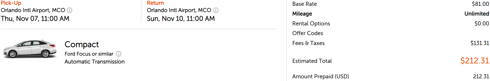 - I searched for the car rental from Orlando Airport. Remember to compare prices to close-by locations to avoid the airport fees. (I kept everything at the same place to make the example easier to do).