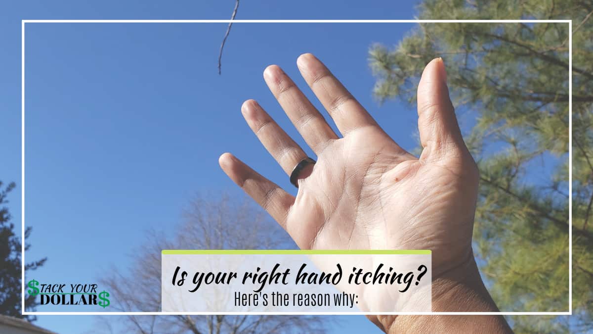 Palm of right hand showing against sky with title text, "Is your right hand itching?"